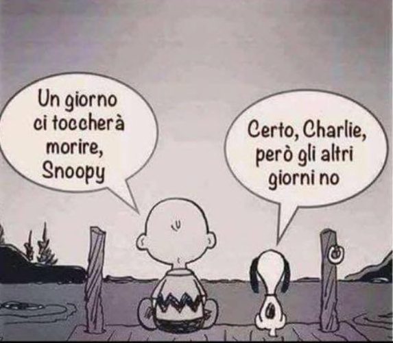 Affacciati ad un bel panorama, concilia la meditazione, CB dice a Snoopy “Un giorno ci toccherà morire!”. “Certo Charlie, risponde il cane, sempre furbastro, però gli altri giorni,  … no!”